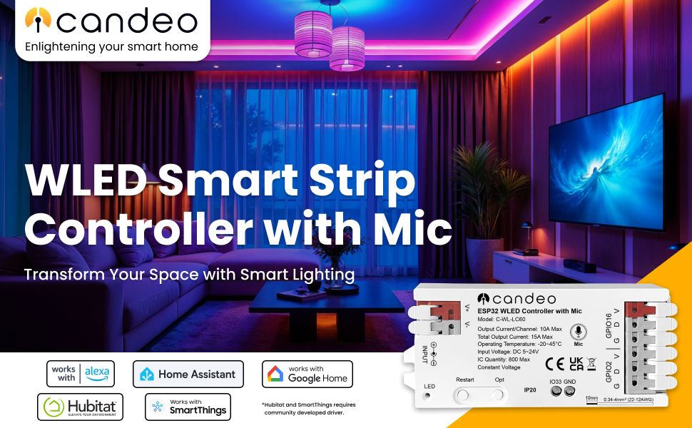 Advanced WiFi-enabled smart controller for professional permanent lighting installations. ESP32-based system with WLED firmware pre-installed for seamless smartphone control via iOS/Android apps. Supports 5V-24V input with auto-detection, compatible with all major addressable LED protocols including WS2812B, WS2811, WS2813, SK6812, and TM1814. Features dual output channels supporting up to 1,500 pixels per port. Built-in effects library with 100+ patterns, music sync capability via integrated microphone, and scheduling functions for automated holiday displays. Integrates with Home Assistant, Alexa, and Google Assistant for voice control. Professional-grade components with overvoltage protection and thermal management. Available in standard and high-power versions. Contact us for 24V and custom builds.